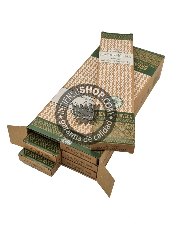 Características, propiedades y beneficios del incienso de nagarmotha de Goloka en caja