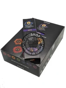 Presentado en cajas de 12 a 15 unidades del incienso Goloka Chakra Ajna en cajas de 10 varillas de 15 gramos.